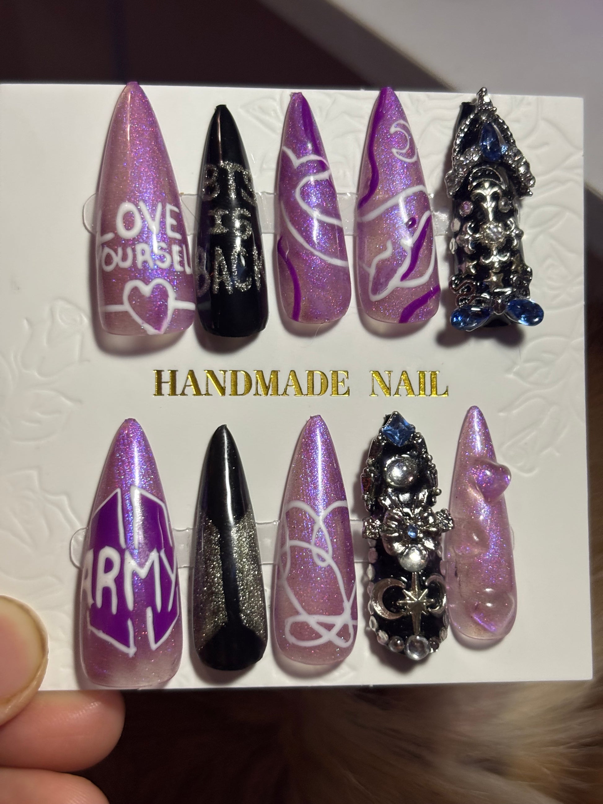 Hand painted custom press on nails. Each nail set comes with a small care package that includes nail glue, a mini nail filer, and a cuticle stick. The nails are extremely durable and very strong they last up to 3 weeks and they come in multiple sizes and styles/lengths. They can also be saved and reused again.